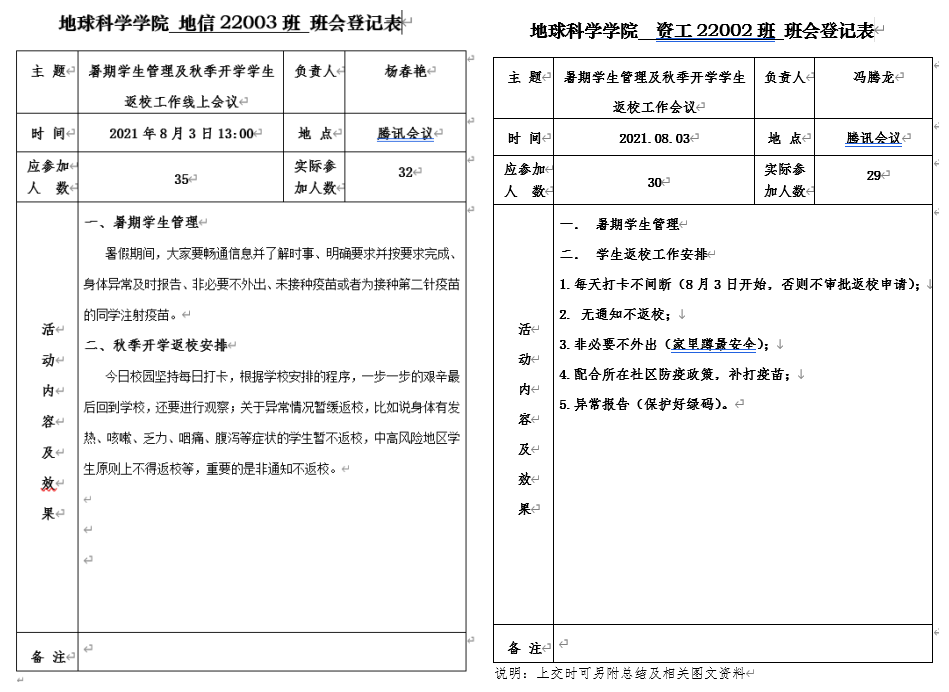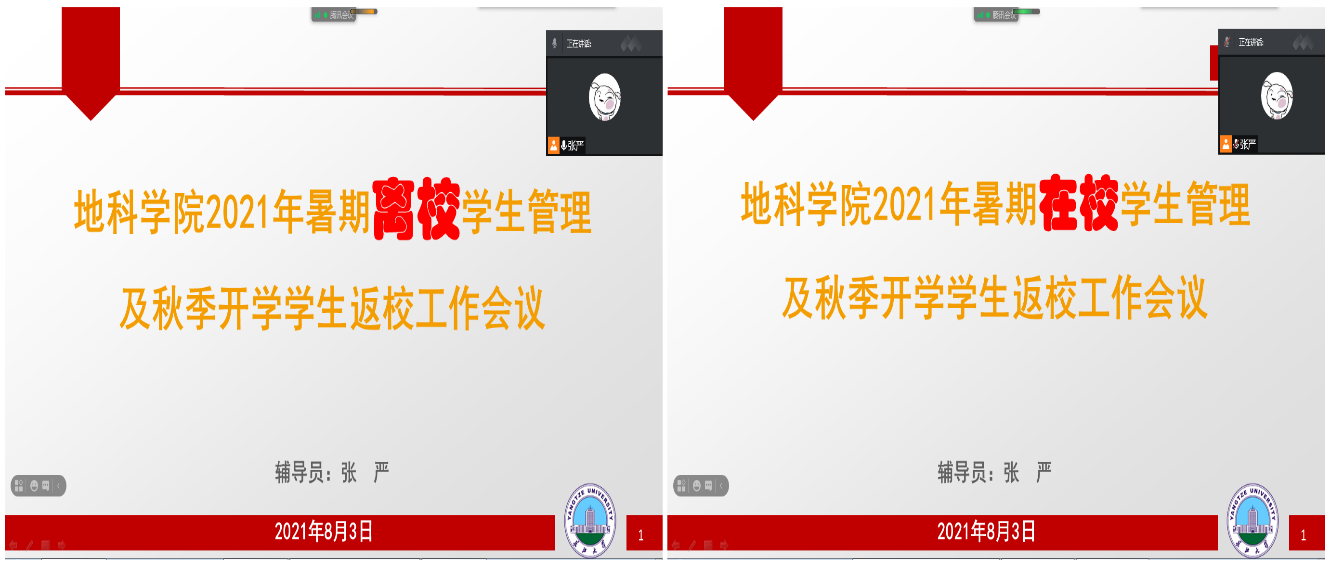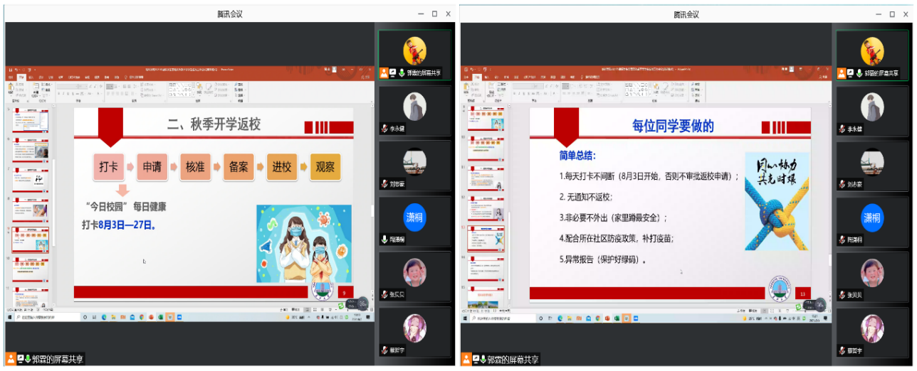 各年级辅导员按“校内”与“校外”两类员工分组组织召开主题班会。会议内容主要包括暑假员工管理和秋季开学返校安排两方面,重点介绍了当前愈发严重的疫情防控形势,要求同学们在暑假期间保持信息的畅通、明确学校的相关要求、非必要不外出并出现问题及时报告,最后要求积极注射疫苗;接下来对返校的6个步骤逐一进行讲解,特别是对“打卡”和“申请”环节的“每天坚持打卡、提交行程绿码和健康绿码、填写返校行程”等重难点工作进行了仔细说明。